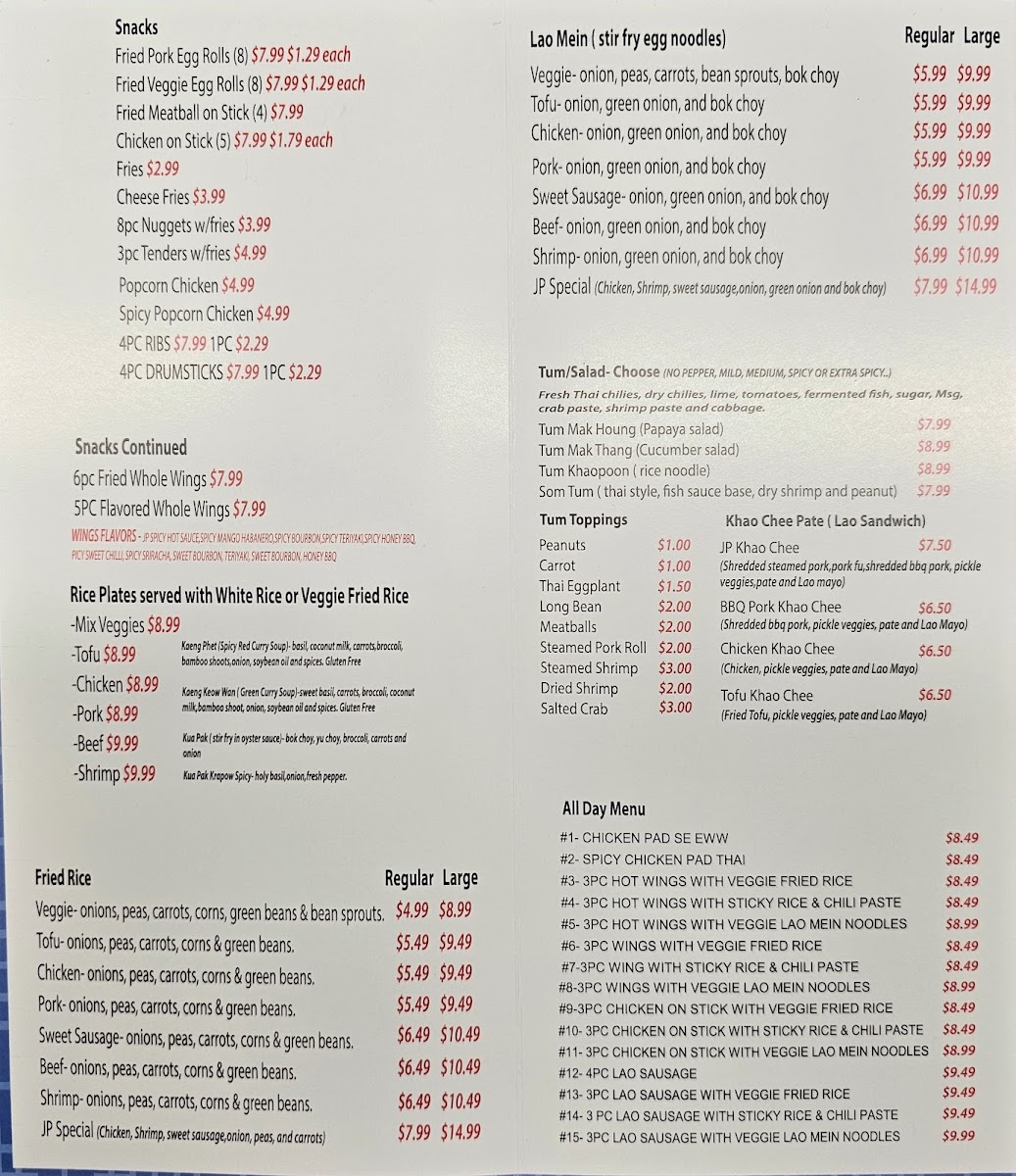 Introducing the menu at JP LAO KITCHEN, an authentic Laotian gem located at 2604 Little Rock Rd in Charlotte, NC. This charming spot serves an array of mouth-watering dishes that are sure to delight food lovers.